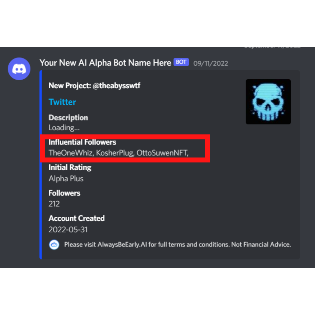 **Discover new project launches -** Our bot keeps on scanning Crypto Twitter all day to bring you the next stealth mints and upcoming projects way before they start minting.&#x20;